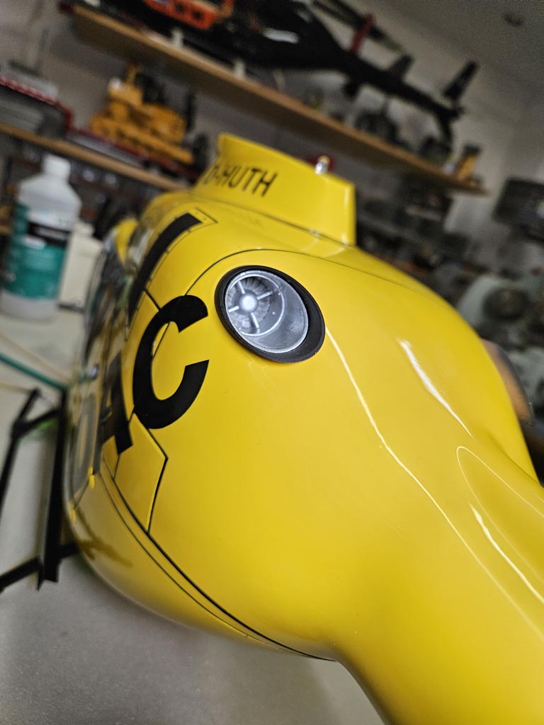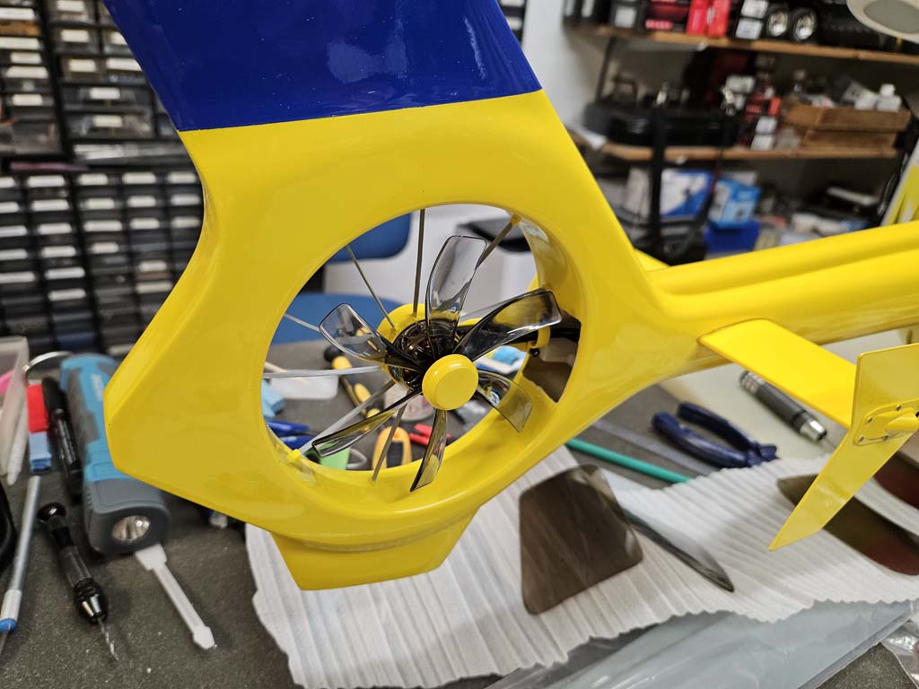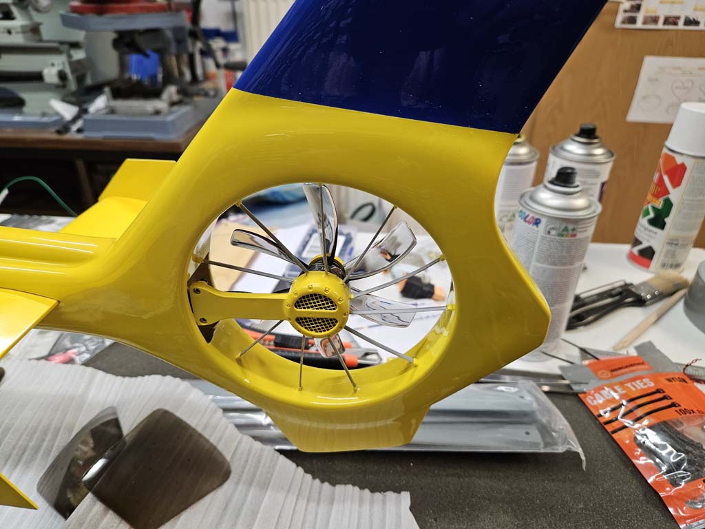 Nun wurde die Verkleidung des Heckrotor lackiert udn danach verschraubt und verklebt.Weiter ging es mit der Seitenbeleuchtung sowie den Frontscheinwerfer.