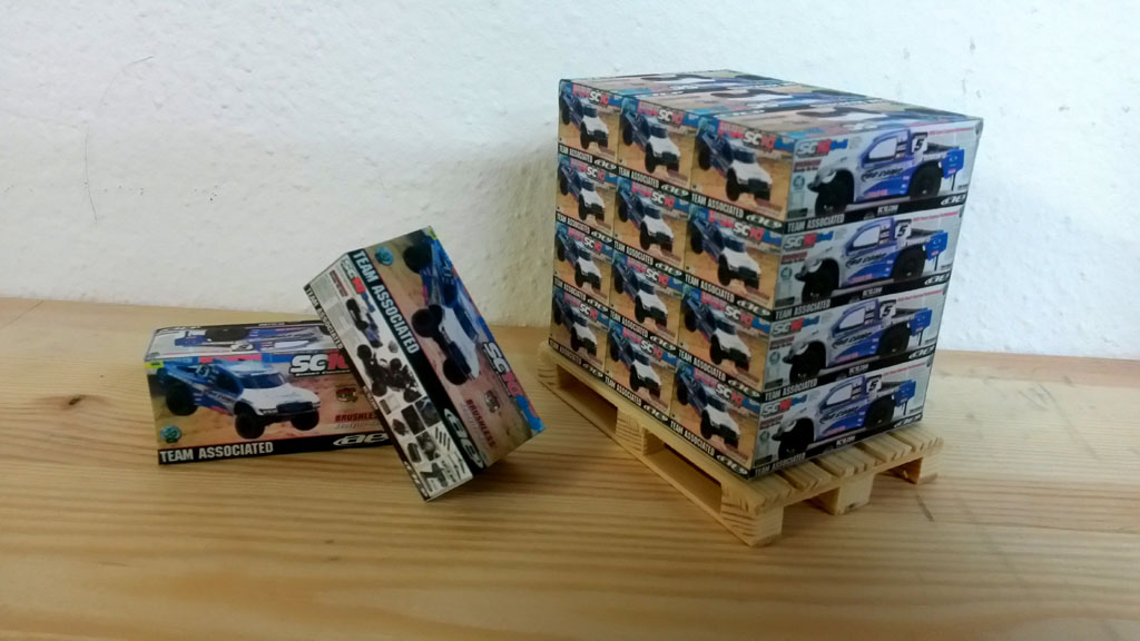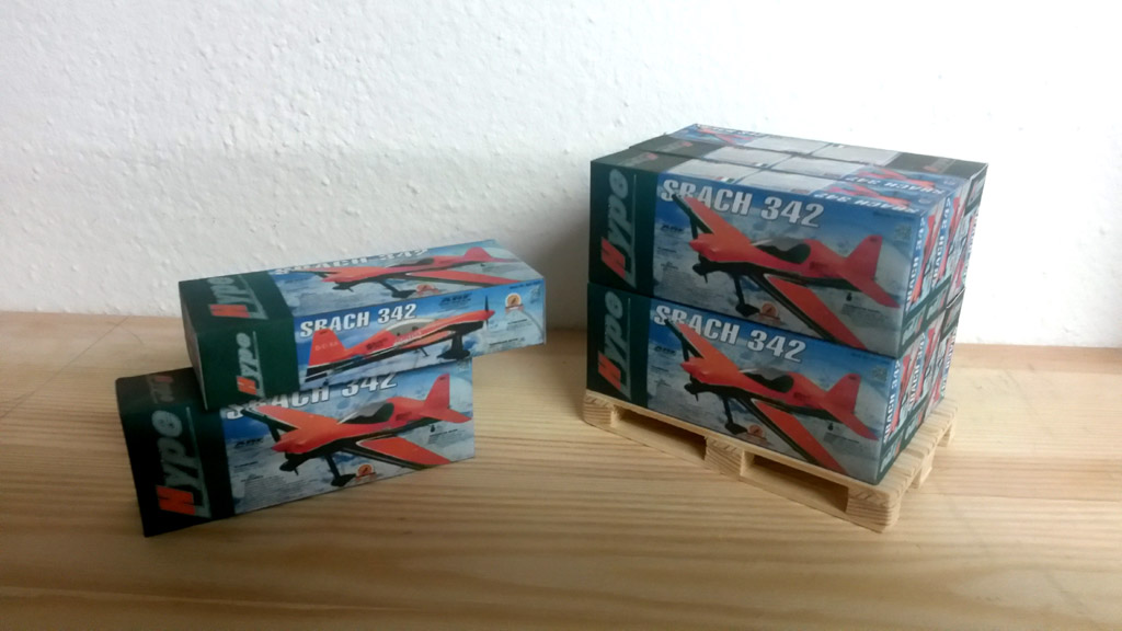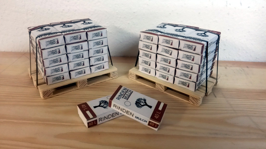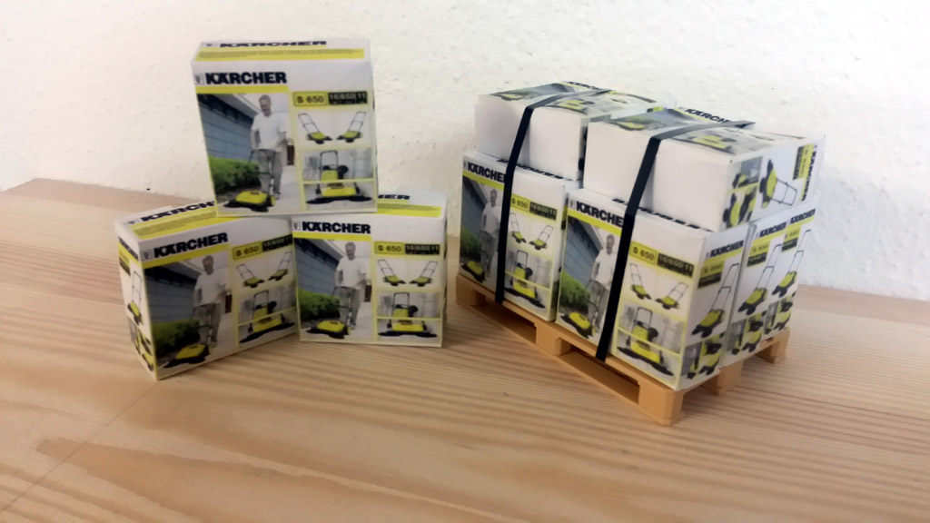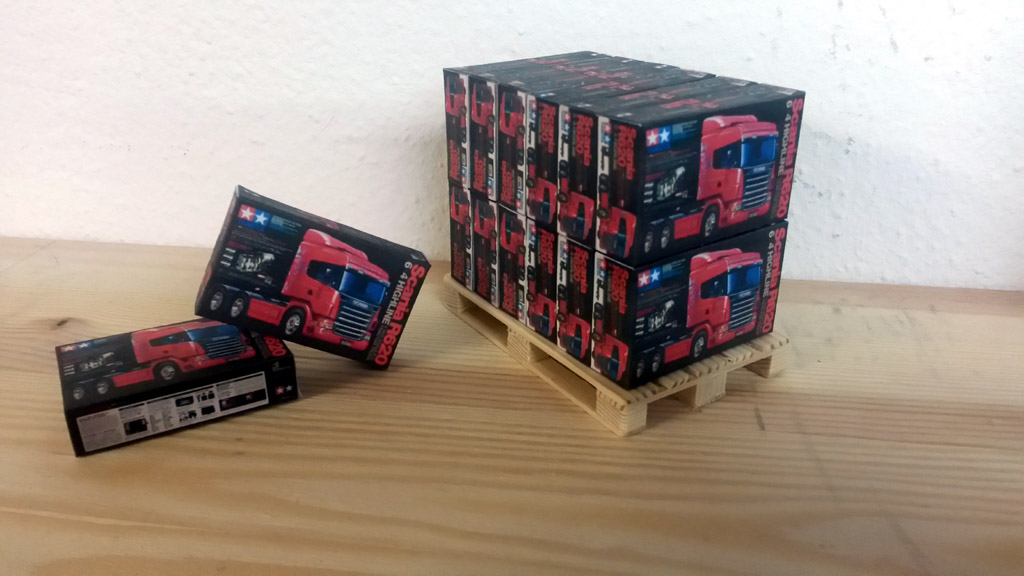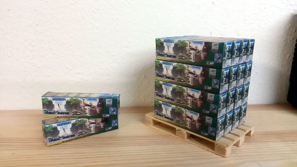 Der Multiplex Park Master 3D als Einzelkarton und als Palette im Maßstab 1/14 und 1/16